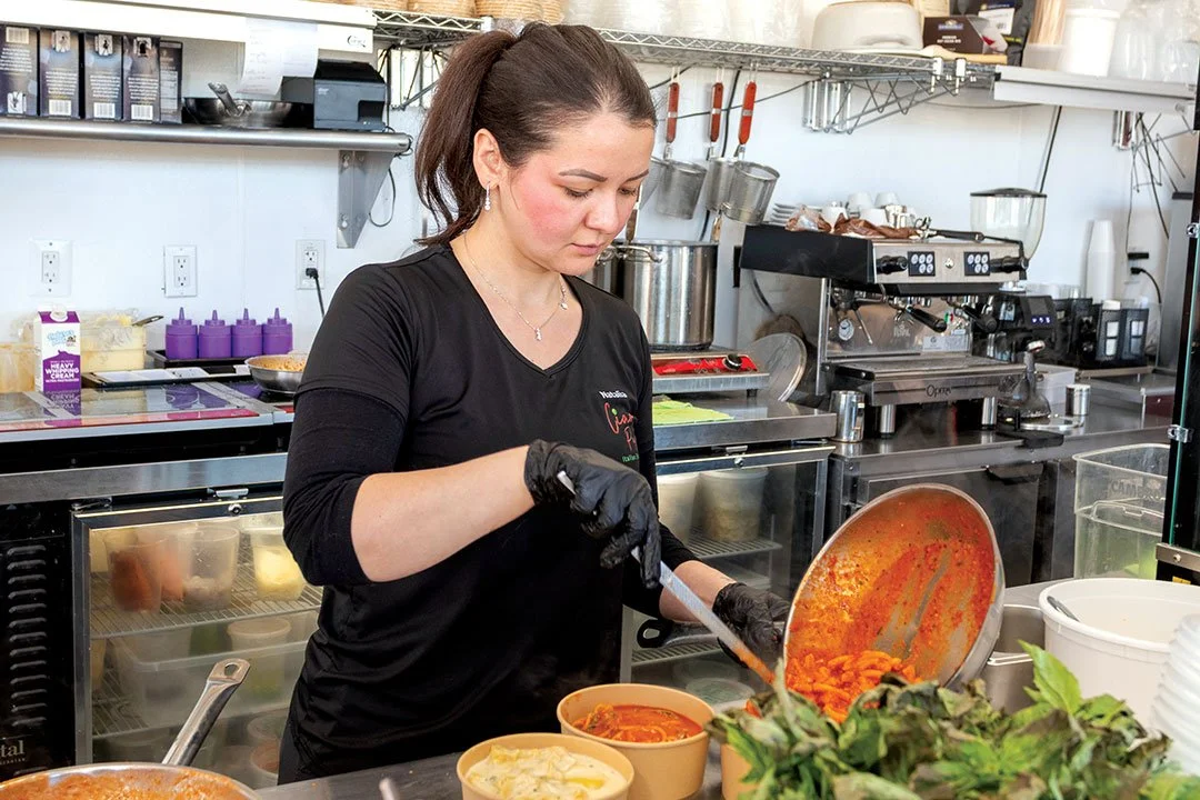 Signage details each dish, but Minale is happy to explain unique ingredients and terms. Puttanesca, for example, (one of Minale’s favorites) is boldly seasoned tomato sauce with olives and capers that originated in Naples. Calabrian Nduja is a spicy, spreadable pork salume that is melted into a piquant red sauce. And ciliegino refers to sweet Sicilian cherry tomatoes. One of the most popular selections is Ciao Pasta’s velvety pink “rosa” sauce, combining tomato and cream. Pair it with languidly curving casarecce (meaning, “homemade”) pasta, a short, gently twisted shape that holds sauce well.